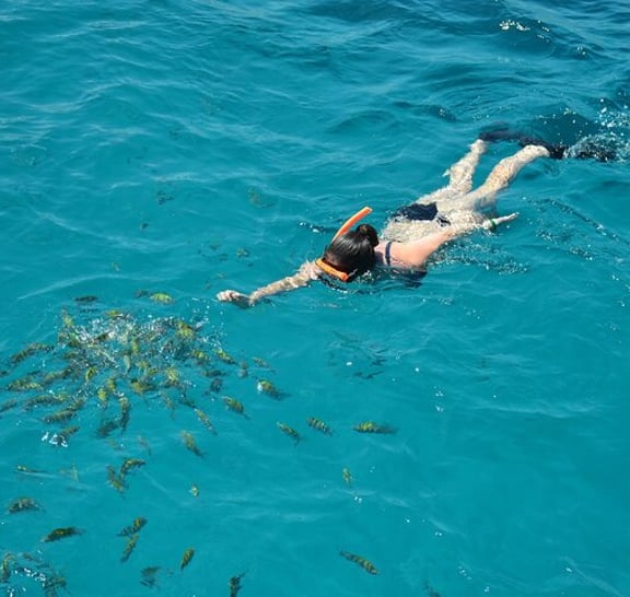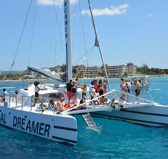 Stechen Sie in See auf einer unvergesslichen gemeinsamen Katamaran-Tour in Montego Bay, perfekt für Familien, Paare und Gruppen. Fahren Sie entlang der malerischen Küste an Bord unseres luxuriösen Katamarans, der auf Komfort und Spaß ausgelegt ist. Genießen Sie lebhafte Reggae- und Soca-Musik, entspannen Sie sich auf großzügigen Sonnennetzen und genießen Sie die atemberaubende Aussicht auf die Karibik. Schnorcheln Sie im Montego Bay Marine Park, einem lebendigen Unterwasserparadies voller tropischer Meeresbewohner. Egal, ob Sie ein erfahrener Schwimmer oder ein Neuling sind, unsere freundliche Crew sorgt für ein sicheres und angenehmes Erlebnis für alle. Zurück an Bord können Sie unbegrenzt alkoholische und nicht-alkoholische Getränke zu sich nehmen, eine kostenlose Fußmassage genießen und mit unserer lebhaften Crew jamaikanische Tanzschritte lernen. Diese familienfreundliche Tour ist vollgepackt mit Spaß, Entspannung und authentischem jamaikanischem Flair. Buchen Sie jetzt für einen Vormittag voller Abenteuer, Musik und Erinnerungen, die ein Leben lang halten werden!
