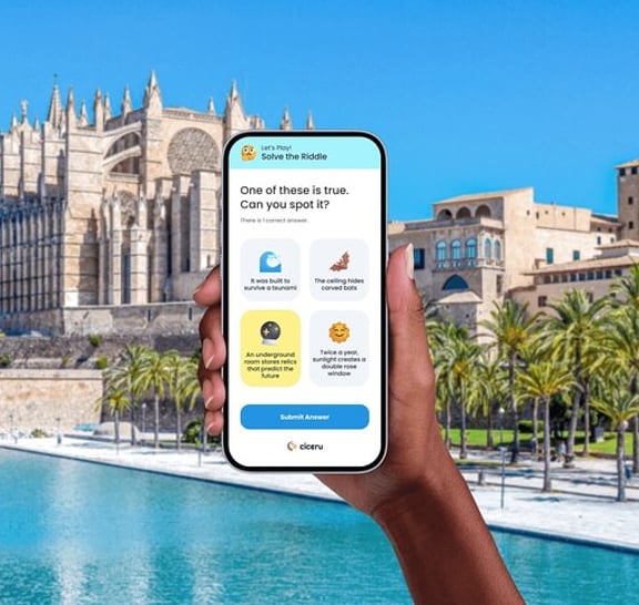 Odkryj Palma de Mallorca na swój sposób dzięki pieszej wycieczce z przewodnikiem Ciceru - audio i tekst w 7 językach, bezpośrednio na telefonie. Bez aplikacji, bez kłopotów - po prostu naciśnij play i odkrywaj! Od inspirującej katedry La Seu po spokojne łaźnie arabskie, przejdź przez wieki cudów architektury, pałaców królewskich i tętniących życiem rynków. Spaceruj tętniącymi życiem ulicami, odkrywaj legendy o średniowiecznych władcach i podziwiaj sztukę współczesną w historycznych fortecach. Każdy przystanek znajduje się w odległości krótkiego spaceru, odsłaniając nową warstwę bogatego gobelinu kulturowego Palmy. Dzięki wciągającym opowieściom i interaktywnym quizom, ta wycieczka przekształca miasto w żywe muzeum, w którym każdy zakątek szepcze opowieści z przeszłości.